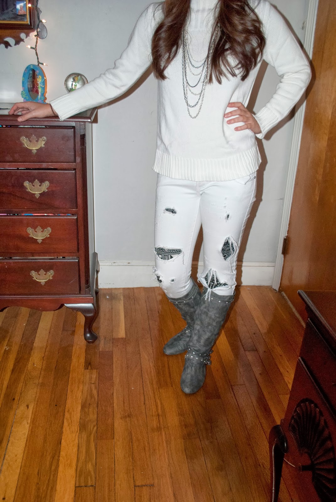 Another great thing to do during the freezing winter months is layer patterned tights or leggings under ripped jeans. There's an extra flair component and your legs will keep warm instead of being exposed.